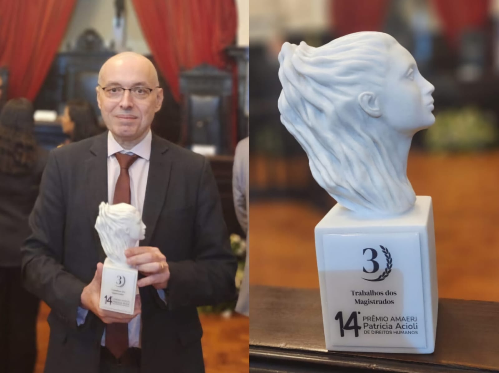 Foto 1: Imagem colorida dividida em duas partes. À esquerda, o desembargador Erick Linhares segura o prêmio. À direita, há um close-up da estatueta do prêmio, que tem a forma de uma cabeça feminina em mármore branco sobre uma base quadrada. A base exibe a inscrição "Prêmio AMAERJ Patrícia Acioli de Direitos Humanos".