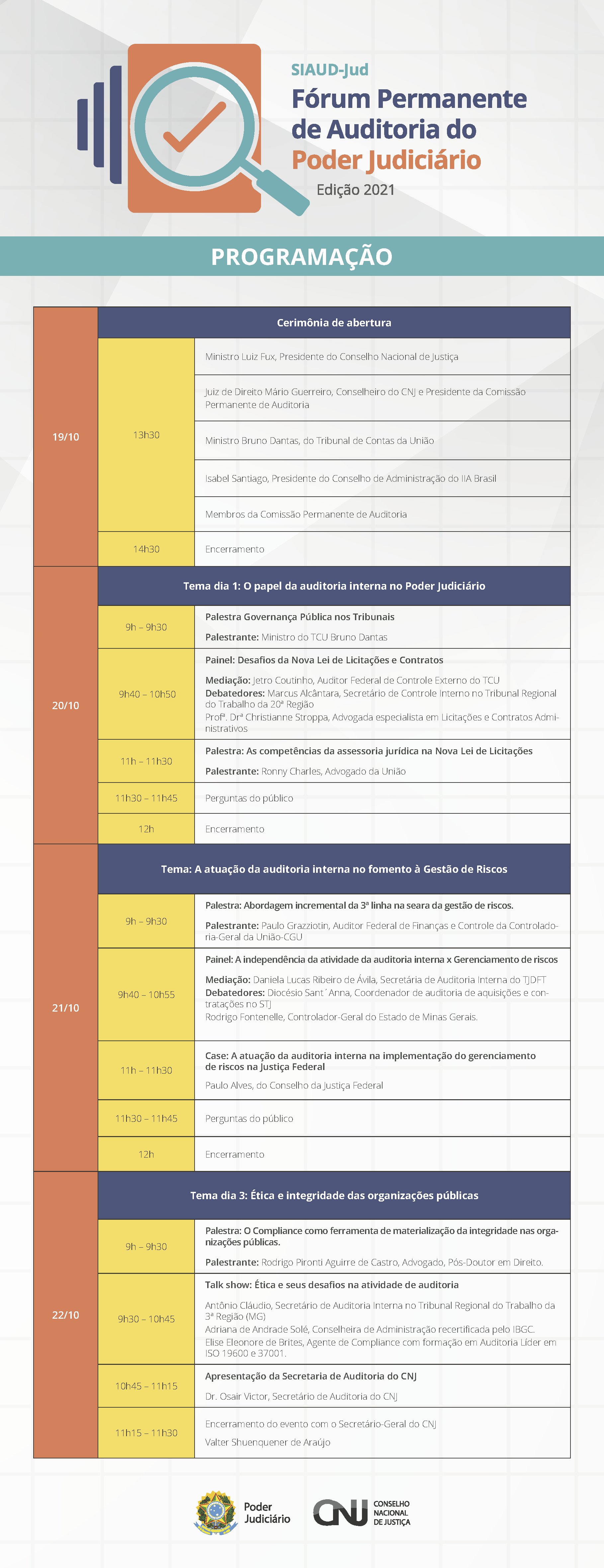 O Conselho Nacional de Justiça – CNJ realizará, com apoio dos órgãos do Sistema de Auditoria Interna do Poder Judiciário – SIAUD-Jud, a primeira edição do Fórum Permanente de Auditoria do Poder Judiciário, nos dias 19, 20, 21 e 22 de outubro de 2021, de forma virtual, com transmissão ao vivo pelo canal do CNJ no Youtube.