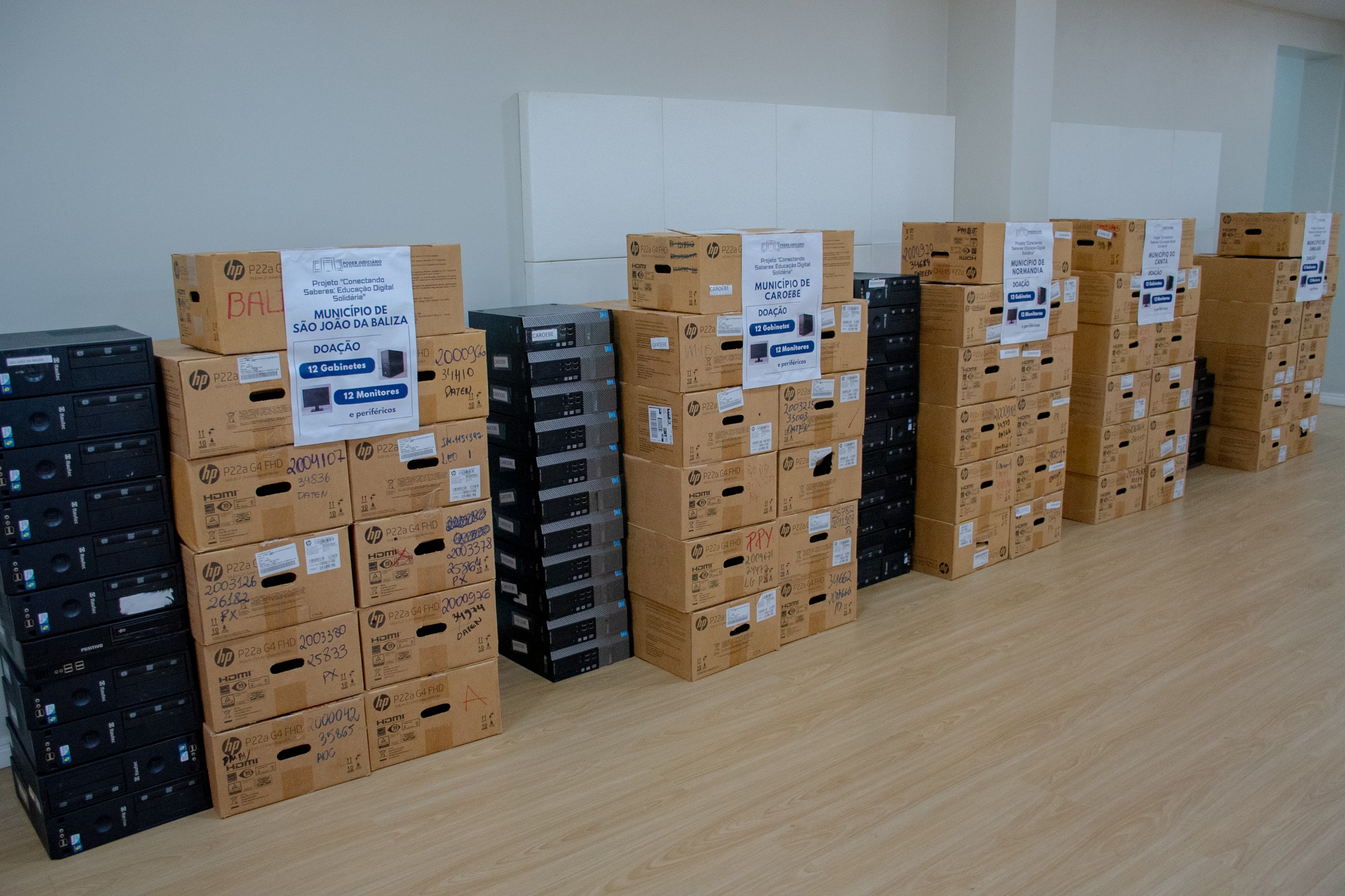 Foto 4: Foto colorida contém as caixas dos computadores para doação.