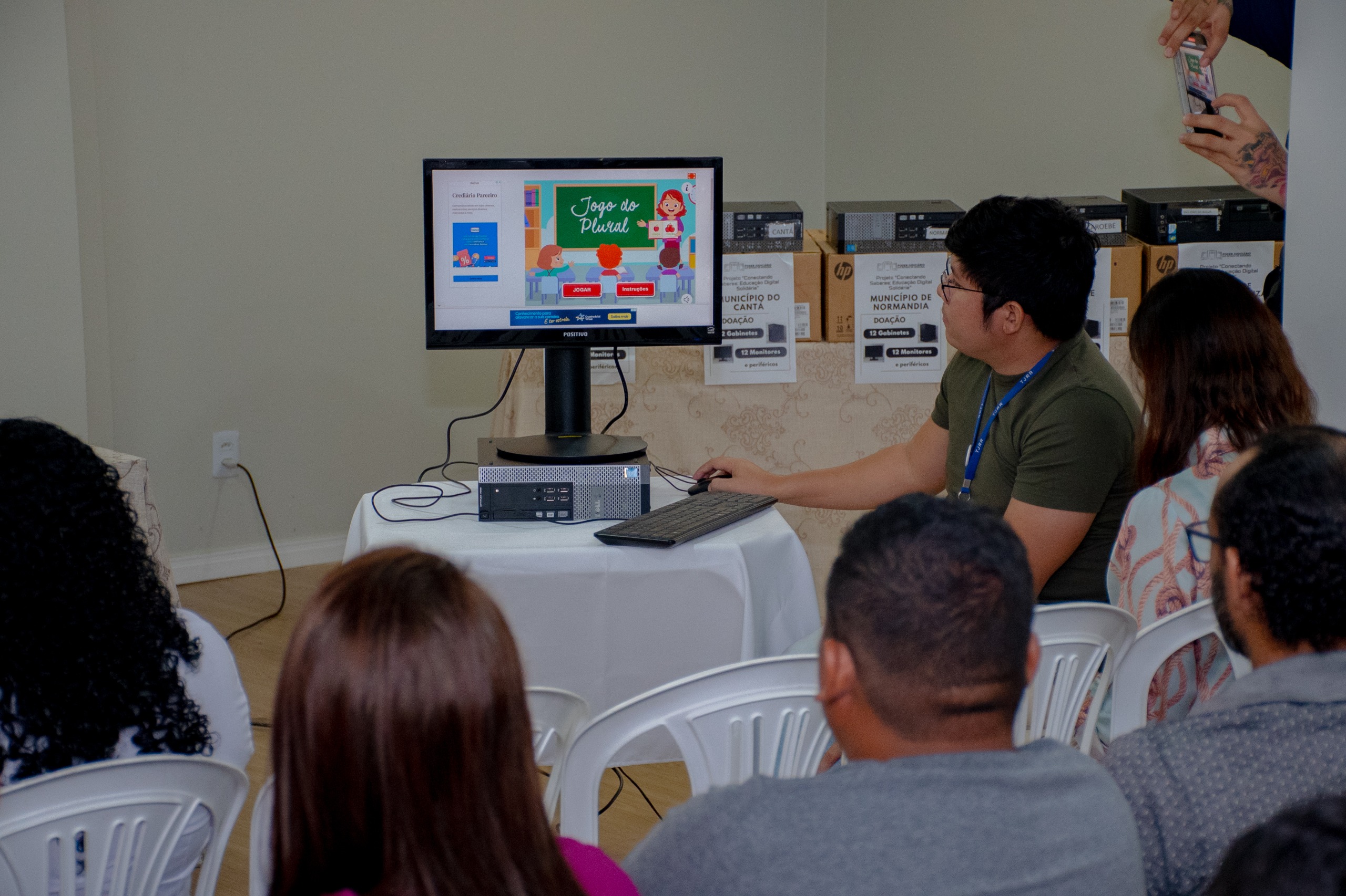 Foto 2: Foto colorida mostra servidor do TJRR mostrando programa educacional em computador para pessoas durante solenidade de doação.