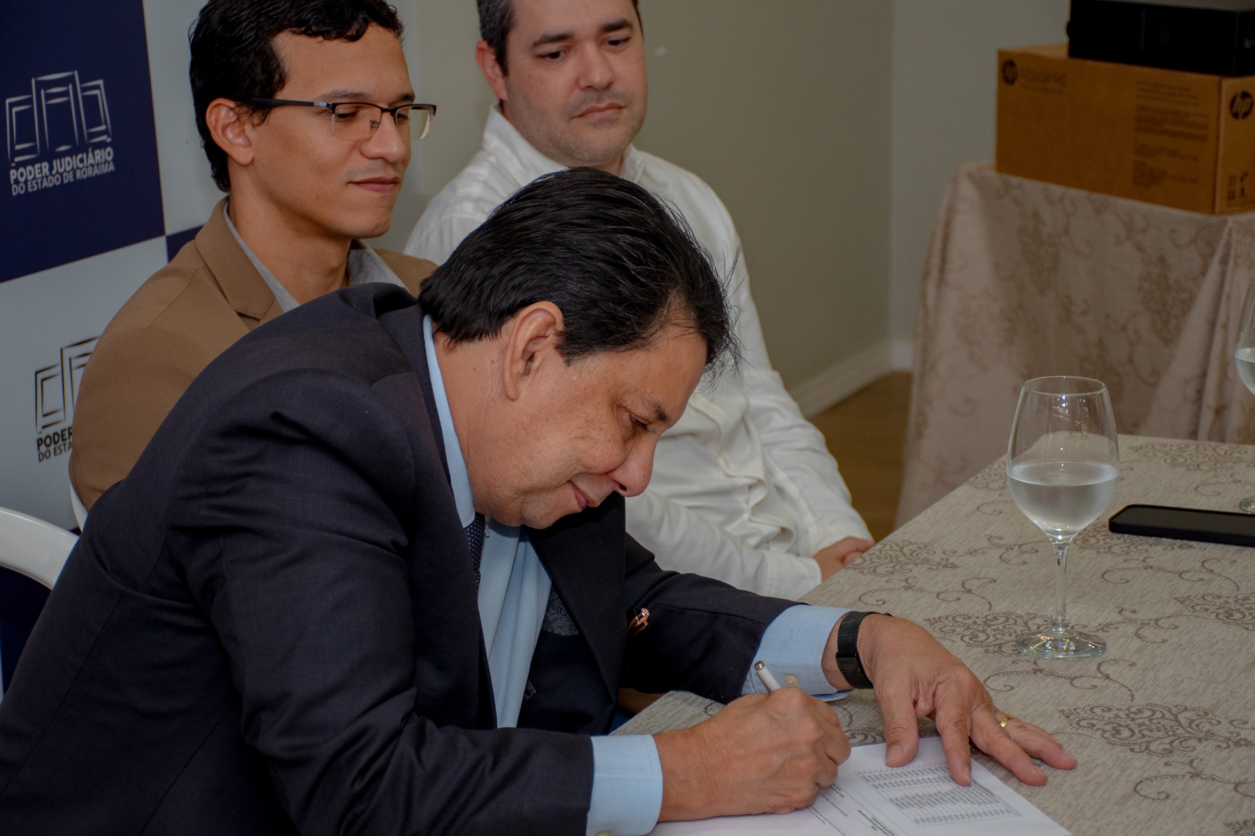 Foto 1: Foto colorida mostra o presidente do TJRR, desembargador Jésus Nascimento, assinando documento durante solenidade de doação. Ao lado dele se encontram mais dois servidores do TJRR.