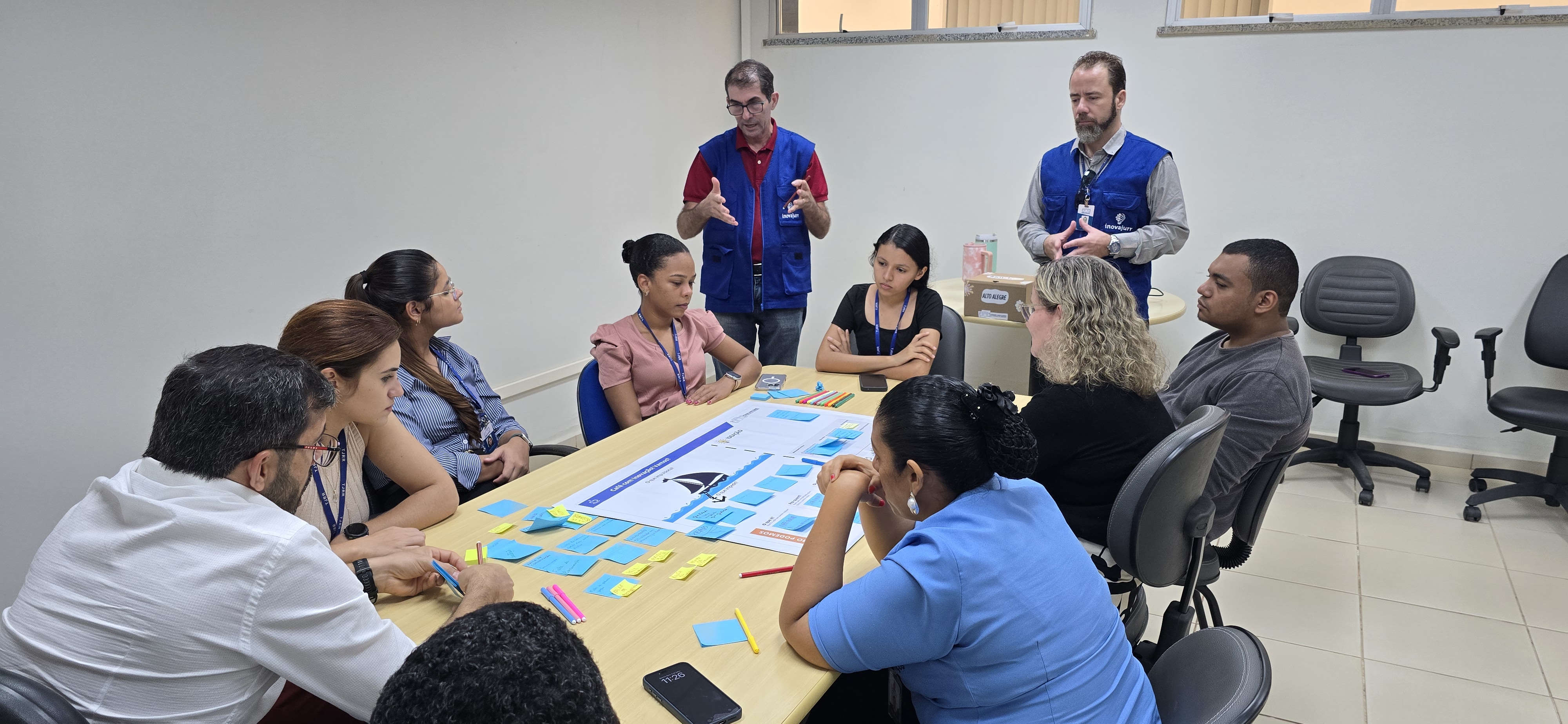 Foto 1: imagem mostra um grupo de aproximadamente dez pessoas sentadas em volta de uma mesa retangular em uma sala de reuniões. Dois homens em pé, vestidos com coletes azuis e camisas vermelhas por baixo, parecem estar liderando a discussão, gesticulando e falando. Na mesa, há um grande pôster ou diagrama com várias notas adesivas coloridas (azuis e amarelas) e materiais de escrita espalhados, indicando uma sessão interativa de brainstorming ou planejamento. As pessoas sentadas estão atentas, algumas escrevendo e outras observando os oradores.