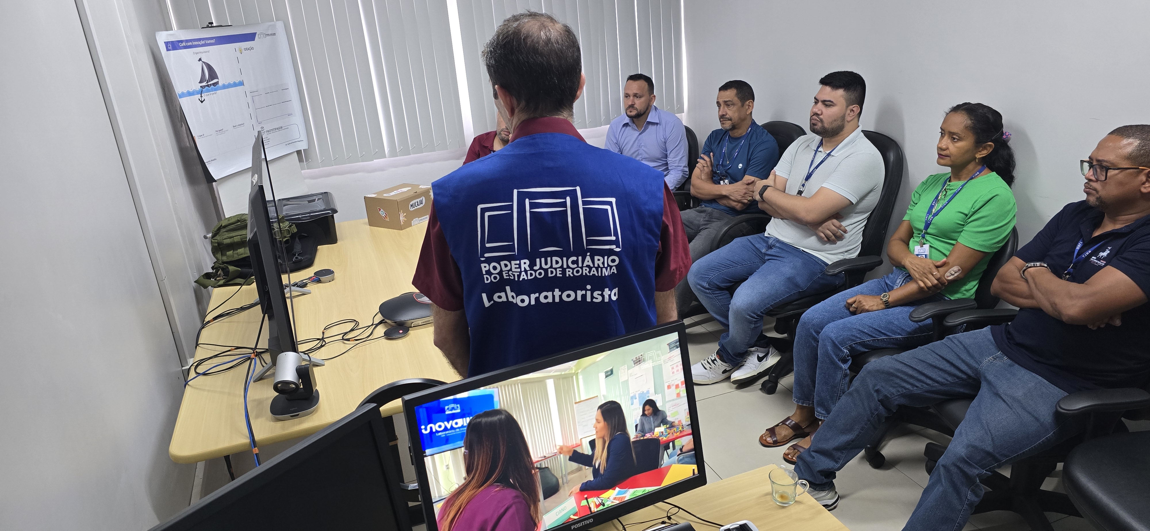 Foto 3: A imagem mostra um homem de costas, vestindo um colete azul com o logotipo "PODER JUDICIÁRIO DO ESTADO DE RORAIMA Laboratório", de frente para um grupo de cinco pessoas sentadas. O homem está apresentando ou explicando algo, e o grupo está ouvindo atentamente. Em primeiro plano, há dois monitores de computador, um dos quais exibe uma videochamada ou apresentação, sugerindo que a reunião pode ter participantes remotos ou que estão assistindo a um conteúdo digital. O ambiente é uma sala de escritório.