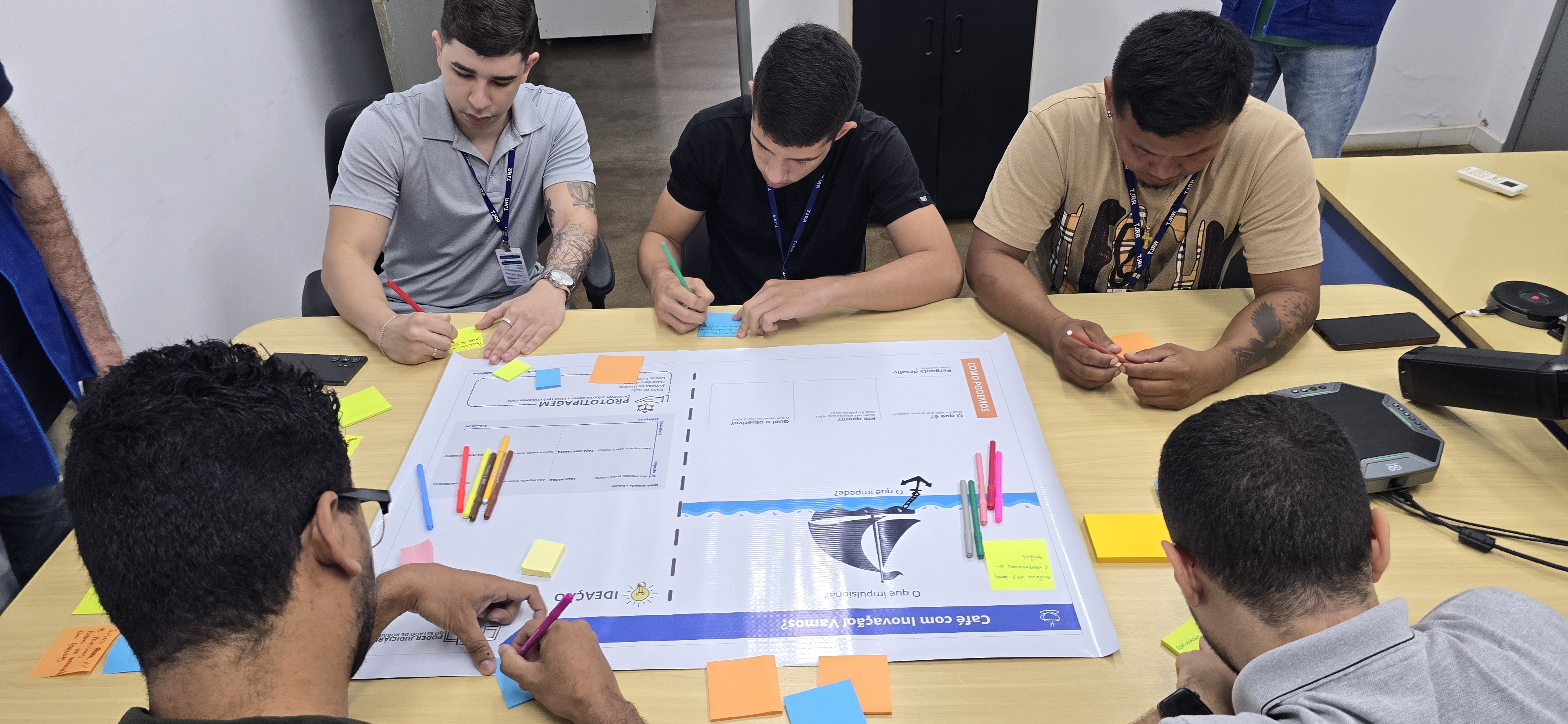 Foto 2: imagem com foco em um grupo de quatro homens jovens sentados em volta de uma mesa, ativamente engajados em uma tarefa. Eles estão curvados sobre um grande diagrama de papel, semelhante aos das outras imagens, e estão escrevendo ou colando notas adesivas coloridas (laranjas e azuis) no diagrama. Há lápis de cor e marcadores espalhados pela mesa. A imagem transmite um senso de colaboração e trabalho concentrado em uma atividade prática.