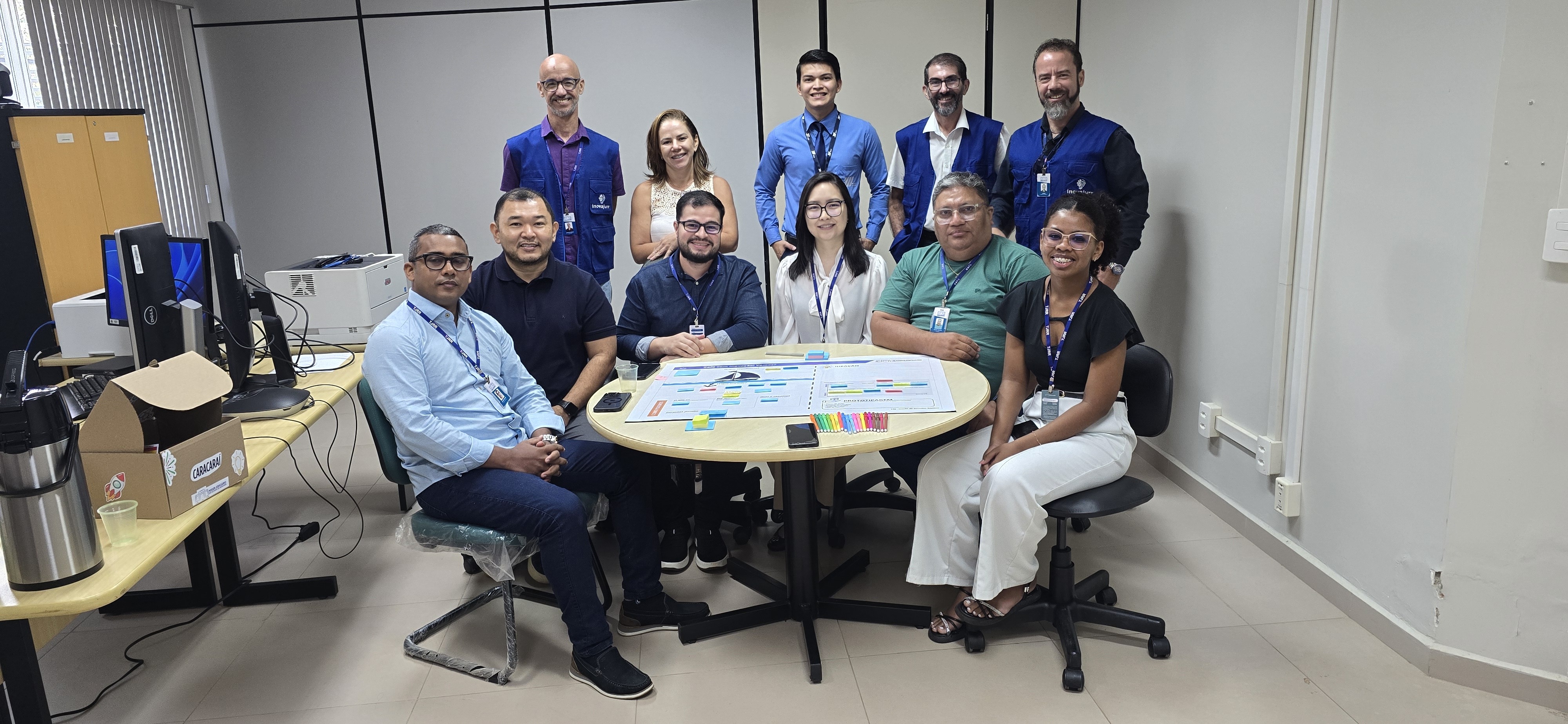 Foto 4: imagem apresenta um grupo maior de cerca de dez pessoas posando para a câmera em um escritório. A maioria está sentada em volta de uma mesa redonda, que também contém um grande diagrama semelhante ao da primeira imagem, com notas adesivas. Há também pessoas em pé atrás da mesa. Todos estão sorrindo e olhando para a câmera, sugerindo um momento de confraternização ou a conclusão de uma atividade. O ambiente é um escritório com mesas, computadores e outros equipamentos de escritório ao fundo.