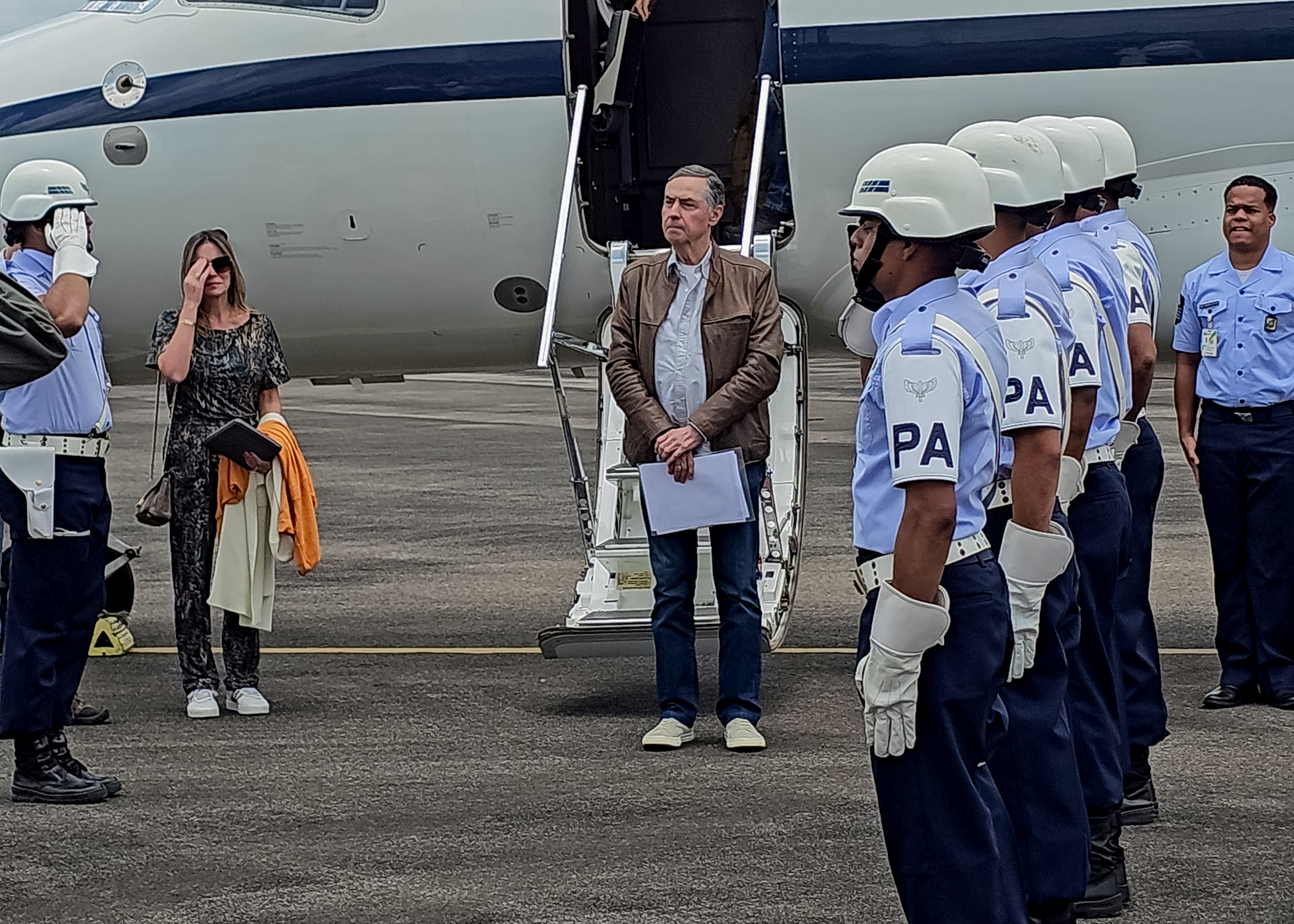 Foto 1: A imagem mostra o ministro Luís Roberto Barroso, presidente do STF e do CNJ, em pé na base da escada de um avião oficial, sendo recepcionado por uma guarda de honra da Aeronáutica. Ele veste uma jaqueta marrom clara, camisa branca e jeans, segurando documentos nas mãos.