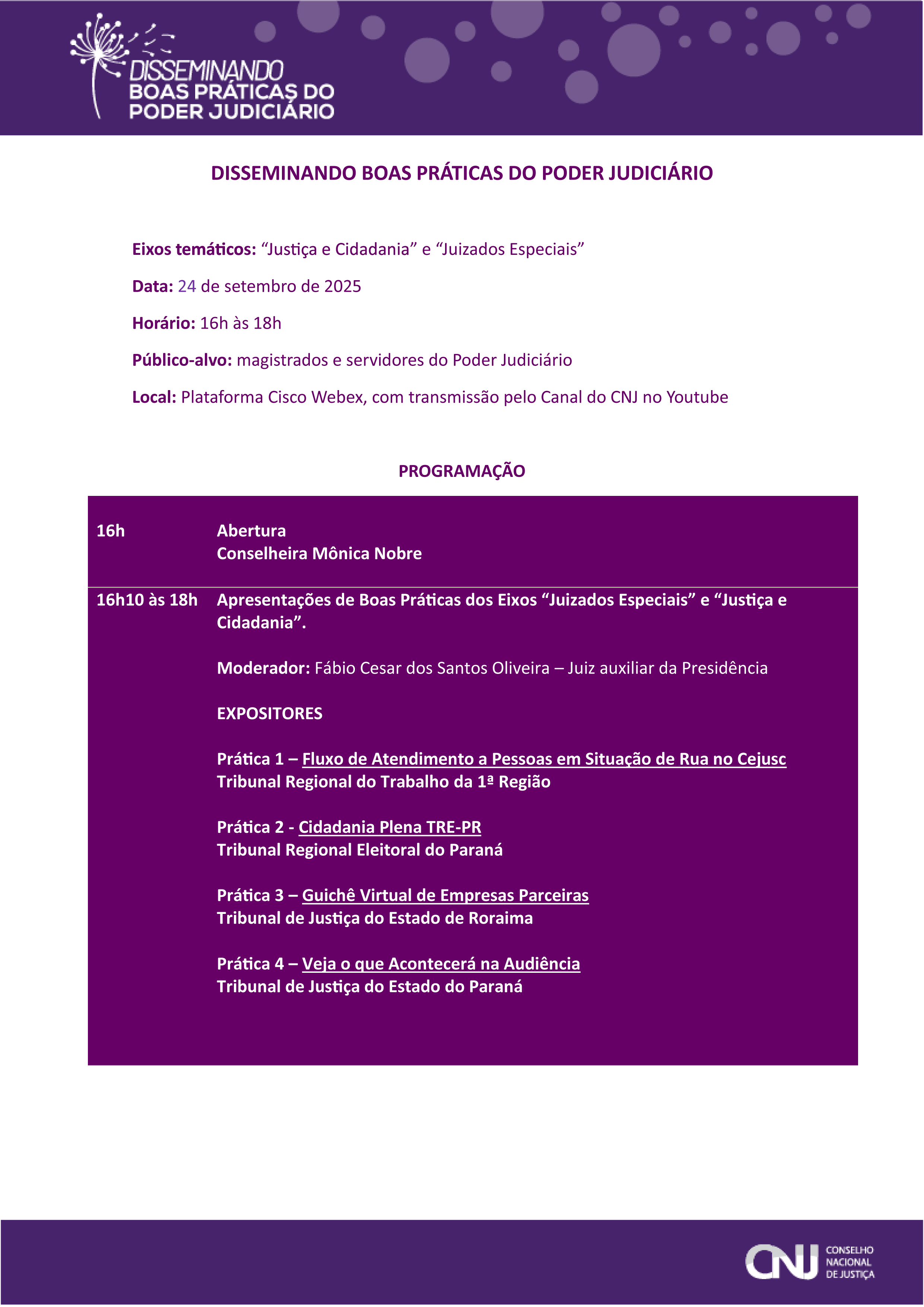 Foto 2: Card institucional com fundo branco e cabeçalho roxo. No topo, há a logomarca do evento: um dente-de-leão estilizado branco com os dizeres "Disseminando Boas Práticas do Poder Judiciário". Abaixo, o título do card: "DISSEMINANDO BOAS PRÁTICAS DO PODER JUDICIÁRIO". Eixos temáticos: “Justiça e Cidadania” e “Juizados Especiais”. Data: 24 de setembro de 2025. Horário: 16h às 18h. Público-alvo: magistrados e servidores do Poder Judiciário. Local: Plataforma Cisco Webex, com transmissão pelo Canal do CNJ no Youtube. Programação: 16h – Abertura Conselheira Mônica Nobre. 16h10 às 18h – Apresentações de Boas Práticas dos Eixos “Juizados Especiais” e “Justiça e Cidadania”. Moderador: Fábio Cesar dos Santos Oliveira – Juiz auxiliar da Presidência. Expositores e práticas apresentadas: Fluxo de Atendimento a Pessoas em Situação de Rua no Cejusc – TRT da 1ª Região. Cidadania Plena TRE-PR – TRE do Paraná. Guichê Virtual de Empresas Parceiras – TJRR. Veja o que Acontecerá na Audiência – TJPR